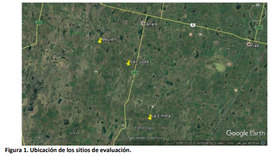 El relevamiento de disponibilidad de agua se realizó en tres predios rurales de la zona de Canals: “La Emma” ubicado al sur de Pueblo Italiano (33°56´27,75´´S; 62°51´15,68´´O), “San José” próximo a Colonia Santa María (33°44´6,01´´S; 62°57´15,58´´O), y “Meulén” ubicado al sur de San Severo (33°38´38,79´´S; 63°4´46,69´´O). Todos los sitios son de aptitud agrícola con manejo en siembra directa y fueron sembrados con soja la campaña 2018/19. El suelo predominante de estos ambientes es profundo, de textura arenosa, y corresponde a la serie Canals Haplustol éntico (http://visor.geointa.inta.gob.ar/). Estos suelos poseen moderada a baja capacidad de retención de humedad (INTA-SAGyP, 1986), pero la presencia de capas freáticas a profundidades tales que permiten el aporte de agua a los principales cultivos de la región, aumentaron su potencial de producción.