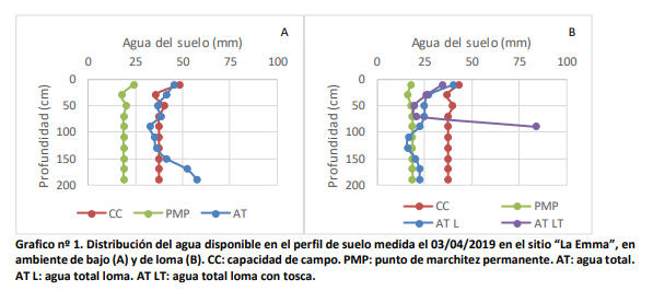 En cada sitio, los primeros días del mes de abril de 2019 se registró la altura de la napa a través de medición en freatímetro simple, y se extrajeron muestras de suelos hasta los 200 cm de profundidad, en capas de 20 cm para determinar el contenido de humedad con el método gravimétrico. En los sitios “La Emma” y “San José” se tomaron muestras en dos ambientes contrastantes del lote (posición de loma o cresta de loma, y posición de bajo o tendido), y en el sitio “Meulén” al ser lote uniforme se extrajo la muestra del único ambiente característico. El contenido hídrico del suelo se expresó en mm de agua disponible (AD) para los cultivos, considerando valores de densidad aparente, y constantes hídricas de capacidad de campo (CC) y punto de marchitez permanente (PMP) de referencias personales (Cazorla, Barraco, com. pers.). El contenido de AD se obtuvo de restar el contenido de agua en PMP al contenido de agua total del suelo (AT). Para los suelos evaluados en este trabajo de la serie Canals, la capacidad máxima de almacenaje es de alrededor de 200 mm hasta los 2 m de profundidad.
