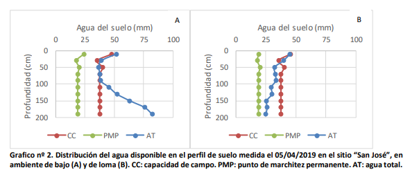 Por último en el sitio “Meulén” se midió la profundidad de la capa freática a 207 cm (fecha de medición: 03/04/2019), y el perfil del suelo evaluado se encontraba totalmente recargado de humedad, y con influencia de la napa a partir de los 80 cm de profundidad. Lo que representa un total de 330 mm de agua disponible hasta los 2 m de profundidad (Figura 3), siendo una situación muy similar al ambiente de bajo del sitio “San José”.
