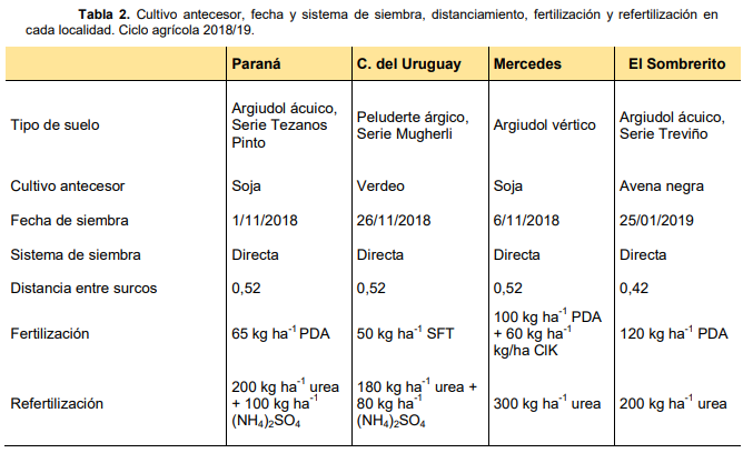 En la Tabla 2 se detallan algunas particularidades de los lotes y el manejo de los ensayos según cada localidad. Se procuró mantener los ensayos libres de malezas e insectos, para lo cual se hicieron los tratamientos químicos correspondientes según lo ameritaba cada situación.