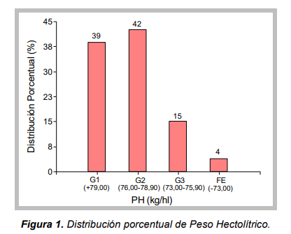 El Peso Hectolítrico promedio del muestreo fue de 78,16 kg/hl (1,6 puntos por debajo de la cosecha anterior) con un mínimo de 72,00 y máximo de 82,70 kg/hl. Cuadro 1. De acuerdo a los resultados obtenidos el 39% del muestreo corresponde a Grado 1 (G1) de comercialización, 42% a Grado 2 (G2), el 15% a Grado 3 (G3) y sólo el 4% se ubicó fuera de estándar (FE) según el estándar de comercialización de trigo pan (Figura 1, Anexos 1 y 2), Resolución 1262/2004 – Norma XX. El Peso Hectolítrico promedio en la Subregión II N fue de 78,20 kg/hl y en la V N de 79,60 kg/hl. En los conjuntos generales del Sudeste de Córdoba fue de 76,80 kg/hl, en el Sur de Santa Fe de 78,40 kg/hl y en el Norte de Buenos Aires de 81,40 kg/hl. Cuadro 3, Anexos 1 y 2. Los menores valores de PH que presenta el sudeste cordobés se deben a la presencia de granos chuzos y a la diversidad de tamaño de grano debido a las condiciones ambientales adversas que se mencionaron anteriormente y que fueron más acentuadas en esta región.