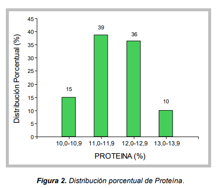 El peso de 1000 granos promedio en la subregión II N fue semejante a la campaña anterior con un promedio de 34,44g (34,60g campaña anterior) y en la V N fue inferior con un valor de 33,82g (36,00g campaña anterior). Cuadro 1 y 3. Las cenizas en grano fueron altas, dentro de los valores promedios esperables para la región central, debido a la gran heterogeneidad de tamaño de grano y presencia de granos chuzos, promediando 1,950% en la II N (1,739% cosecha anterior) y 1,970% en la V N (1,796% cosecha anterior). El rendimiento de harina con la molienda experimental Bühler fue de 69,8% (72,3% cosecha anterior) en la II N y de 70,3% (71,6% campaña anterior) en la V N. La proteína se relacionó con el rendimiento y debido a la caída de éste se observa un porcentaje de proteína alto en general como no se daba desde la campaña 2012/13, siendo el aspecto más destacado de esta cosecha. El promedio del relevamiento fue de 11,9%, Cuadro 1, un 2,1% superior a la cosecha anterior que tuvo 9,8% de proteína promedio y 0,9% superior a la base de comercialización del 11%. El 85% de las muestras superó el 11% de proteína. Figura 2. El mínimo fue de 10,2% y máximo fue de 13,5%. Anexo 1. La subregión II N tuvo un promedio de 12,0%, la V N se ubicó en 11,9%, SE Córdoba con 12,5% promedió el valor más alto y Sur Santa Fe en 11,6%. Cuadro 3. En el Norte Buenos Aires, donde los rendimientos promedios fueron mayores, la proteína descendió a 10,8%. Se debe tener en cuenta que para recibir bonificaciones por contenido de proteína ésta debe ser superior al 11% y el PH ser igual o superior a 75 kg/hl.