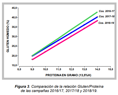 El contenido de gluten promedio de todo el muestreo realizado en la región central del país se ubicó en 29,5% (23,2% cosecha anterior), con mínimo de 22,4% y máximo de 37,5 %, dependiendo de las condiciones de los lotes y de la zona muestreada, correspondiéndose con la proteína. La subregión II N tuvo un gluten húmedo de 29,6% y la V N de 29,1%, siendo el norte de la Pcia. de Buenos Aires de 25,9%, el valor más bajo igual a lo ocurrido con la proteína. Esta campaña presentó una relación gluten/proteína inferior a la observada en las últimas dos campañas. Figura 3, Cuadro 2.