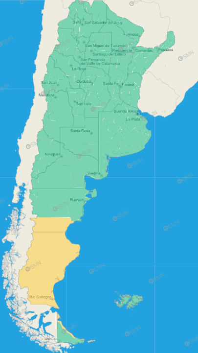 Santa Cruz: Costa de Deseado – Meseta de Deseado – Meseta de Magallanes – Meseta de Lago Buenos Aires – Meseta de Río Chico – Cordillera de Lago Buenos Aires – Cordillera de Río Chico –  Cordillera de Güer Aike – Cordillera de Lago Argentino – Meseta de Corpen Aike – Meseta de Güer Aike – Meseta de Lago Argentino – Costa de Corpen Aike – Costa de Güer Aike