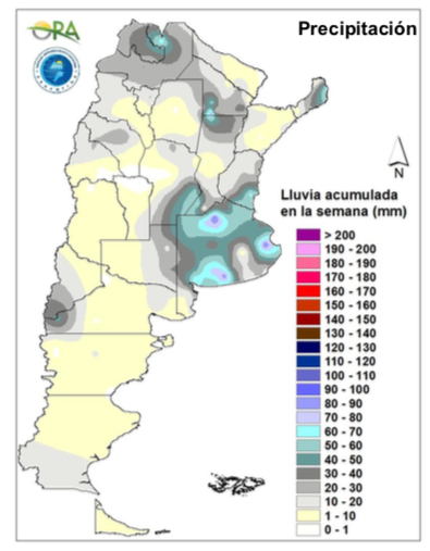 Se registraron precipitaciones significativas en las provincias pampeanas en general, y en la zona núcleo en particular. Las lluvias más importantes se dieron en la provincia de Buenos Aires: Junín (92mm), Dolores (90mm), Tres Arroyos (87mm) y Coronel Pringles (75mm). Fuera de esta región se dieron eventos en la mayor parte del NOA y del NEA, donde se destacan Santa Sylvina, Chaco (85mm), Bernardo de Irigoyen, Misiones (69mm) y Orán, Salta (66mm).