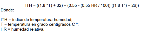 Durante los años indicados, en la casilla meteorológica de la EEA “Colonia Benítez” ubicada a 30 km de la unidad experimental, se registraron todos los días los datos de: temperatura ambiental, humedad relativa, velocidad del viento y radiación solar; durante los meses del servicio de monta a las vacas (septiembre a diciembre). Con esta información se calculó el índice de temperatura-humedad (ITH), de acuerdo a lo establecido por Ingraham et al. (1974) con la siguiente ecuación: