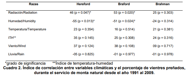 Uribe et al. (2001) determinaron que la humedad relativa y la radiación, son las principales causas de disminución en las tasas de crecimiento, fallas en la reproducción y aumento en la mortalidad embrionaria y fetal temprana. Por otro lado, se sabe que el color del pelo y la textura de la piel oscura, absorben más calor; comparadas con las claras en igualdad de condiciones ambientales (Col ba et al., 2002). Al evaluar el efecto de la humedad relativa (P < 0.05), se encontró una relación negativa con el número de vacas vacías.