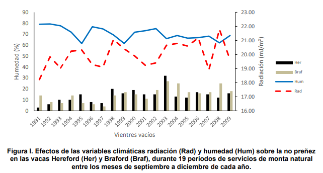 Al analizar los índices de preñez, se observó que los porcentajes de preñez tenían una correlación con las variables climáticas en las razas HE y BR. La radiación y la humedad relativa impactan significativamente (Cuadro 2). En la raza BH no presentó ninguna corelación. En la Figura I se observa que la mayor cantidad de vacas no preñadas coinciden con un aumento en la Radiación. Para vacas no preñadas se tuvo en cuenta a las pérdidas embrionarias tempranas (< 42 días), como posible causa de éstas, debido a que la mayoría de las muertes pre-natales ocurren durante los primeros días después de la fecundación y durante el proceso de implantación del embrión en el útero (Sartori, 2006).