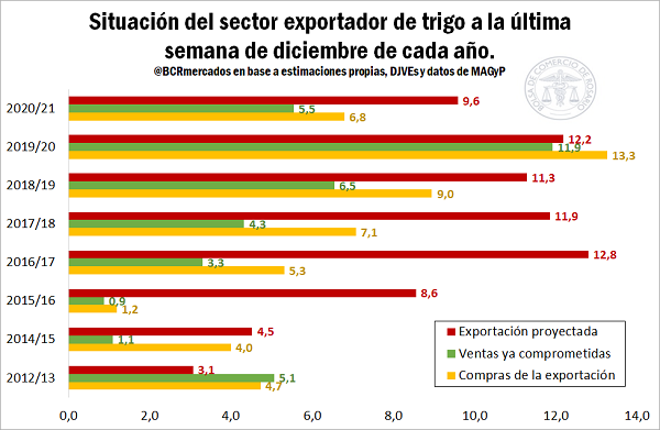 Hacia la última semana de diciembre de 2020, el sector exportador se había hecho de 6,8 Mt del cereal, un 71% de lo proyectado para enviar al exterior en la campaña, y llevaba vendido 5,5 Mt, un 58% del total a despachar. En tanto, a igual fecha del año anterior, la exportación ya había adquirido más de lo necesario para cubrir sus necesidades de exportación (109%), y habían registrado ventas al exterior por 11,9 Mt, un 98% de lo exportado en toda la campaña. Cabe mencionar que la rápida dinámica comercial que tuvo lugar a partir de octubre del año 2019 constituyó un fenómeno inusual en la comercialización de granos de los últimos años en Argentina. La veloz negociación de la campaña 2019/20 previo al inicio formal de la campaña estuvo motivada en gran parte por el clima de incertidumbre política y económica que experimentaba el país tras las elecciones presidenciales.