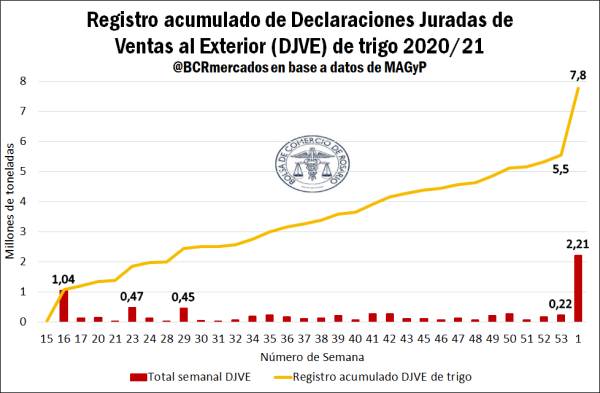 Más allá del análisis comparativo para las diferentes campañas al 30 de diciembre que se observa en el gráfico anterior, según los últimos datos oficiales de compras internas, en la primera semana del año 2021 se registró un crecimiento en las Declaraciones Juradas de Ventas al Exterior (DJVE) de los principales cultivos y subproductos. El sector exportador registró DJVE de trigo por 2,21 Mt en dicha semana, hasta el día 7 de enero. Contabilizando las mencionadas DJVE anotadas hasta el 7 de enero, el sector exportador triguero lleva vendido al exterior 7,8 Mt del cereal 2020/21, lo cual representa el 81% de lo esperado a exportar en todo el ciclo comercial (9,6 Mt).