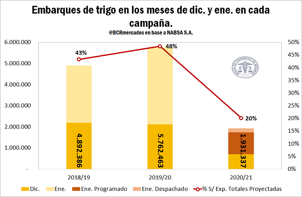 En cuanto el trigo efectivamente despachado desde los puertos argentinos al exterior, en los últimos años ha habido una marcada tendencia de altos volúmenes embarcados en los primeros meses del ciclo comercial. Sin embargo, los envíos de trigo de la nueva campaña presentan un importante atraso respecto de lo ocurrido en los años anteriores. En las últimas dos campañas, de acuerdo a datos de la agencia de navegación marítima NABSA S.A., el total despachado durante el mes de diciembre superó los 2,1 Mt, mientras que el total de trigo embarcado en el pasado mes ascendió a apenas 697.000 toneladas, un 67% menos que en 2019/20.