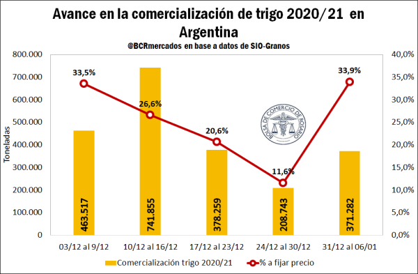 Por otra parte, en cuanto al avance en la comercialización interna de trigo en Argentina, luego del gran dinamismo en la concreción de negocios en las primeras semanas de diciembre tras comenzar oficialmente el nuevo año comercial 2020/21, se observó una merma en los mismos. En este sentido, se alcanzó un piso en la última semana de 2020 con adquisiciones por parte de la industria y la exportación por 208 mil toneladas.