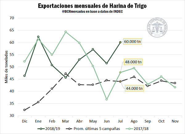 Las exportaciones de harina de trigo tuvieron una destacada recuperación en el mes de julio cuando totalizaron 60.061 toneladas, la segunda marca más alta en lo que va de la campaña sólo después de enero (62.235 tn). En el ciclo 2018/19 se exportaron 12.000 toneladas más de harina que en el julio anterior y 16.000 tn más que los despachos promedio para este mes en las últimas cinco campañas. El crecimiento de los despachos en julio 2019 respecto del año pasado fue impulsado por las mayores importaciones de harina de Bolivia que este año compró 10.000 toneladas más que en julio de 2018. También Brasil incrementó sus importaciones en julio en 2.300 toneladas, en comparación al julio pasado. Asimismo, las exportaciones mensuales del subproducto de trigo este año se ubicaron siempre, con excepción de marzo, por encima del promedio mensual de las últimas 5 campañas.