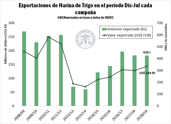 En los primeros ocho meses de la campaña 2018/19, las exportaciones acumuladas de la industria triguera son de 426.300 toneladas, con una performance similar a la de la campaña anterior. Sin embargo, el valor de los despachos realizados entre diciembre y julio esta campaña sí difiere de lo percibido en el ciclo 2017/18. A partir de la mejora interanual del precio FOB de la harina de trigo argentina, el valor exportado en la actual campaña ya alcanza US$ 143,7 millones. Este valor es un 12% superior al valor acumulado en el mismo período del ciclo anterior y es la cifra más alta para el período en 7 campañas.