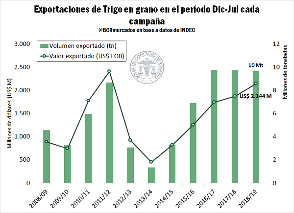En cuanto a las exportaciones nacionales de trigo en grano, éstas acumulan 9,7 Mt en la campaña 2018/19, en línea con los volúmenes exportados en los últimos dos ciclos. Sin embargo, en términos de valor FOB sí se observa una fuerte recuperación. Los despachos del período Dic-Jul en la actual campaña ya alcanzan US$ 2.143 millones, un 14% más que la campaña pasada.