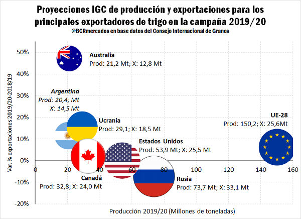 El primer exportador del ciclo 2019/20 volvería a ser la Federación Rusa con despachos de 33,1 Mt, que si bien se recortarían en un 7% respecto del año anterior, su volumen equivale a 1 ½ cosecha argentina. Siguen a Rusia las exportaciones de la Unión Europea (25,6 Mt), Estados Unidos (25,5 Mt), Canadá (24 Mt) y Ucrania (18,5Mt). Según el Consejo, Argentina volvería a ser el sexto país exportador mundial de trigo con 14,5 Mt, que representan un incremento del 11% respecto de las exportaciones 2018/19 estimadas por IGC.