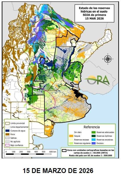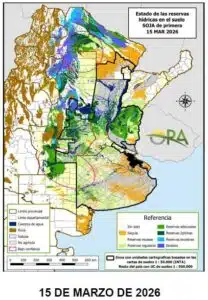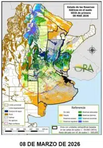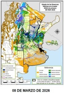 En contraste, el NEA mantiene una situación opuesta. Se consolidan áreas deficitarias en Chaco y el este de Formosa, mientras que el centro de Corrientes registra un marcado deterioro de las reservas tras un febrero seco y lo que va de marzo.