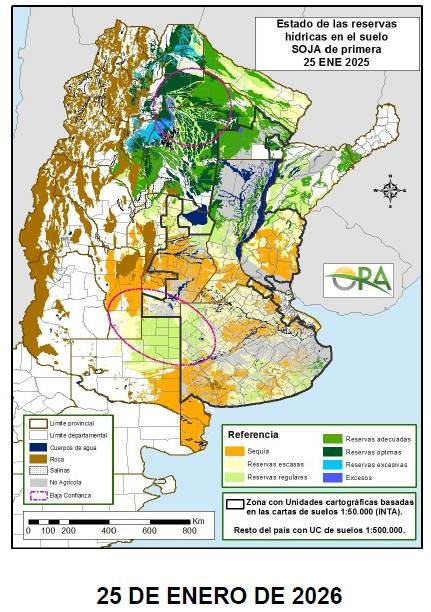 La contracara del mapa se observa en La Pampa y el oeste de Buenos Aires, donde los mayores acumulados de lluvia de la última semana permitieron una recuperación significativa. Estas áreas pasaron de estados de sequía o reservas críticas a perfiles mayormente clasificados como regulares a adecuados, aportando algo de alivio en una campaña marcada por la alta variabilidad climática.