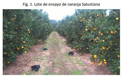 Características del cultivo El cultivo elegido para los ensayos fue un lote de naranja Salustiana sobre pie trifolio, con una distancia de plantación de 5×3 m y una producción que en la campaña 2017 fue de 75 tn/ha.