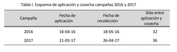 Las aplicaciones se realizaron con pulverizadora de turbina hidroneumática calculando el volumen de caldo a través de la metodología TRV (Tree Row Volume). El caldo se preparó adicionando 0.4 l de formulado comercial “Envidor” más 2 l de aceite en 2000 l de agua y el volumen utilizado fue de 1625 l/ha. En la tabla I se presenta el esquema de aplicación y cosecha para las campañas 2016 y 2017. Las muestras se tomaron por triplicado enviando inmediatamente al laboratorio para su procesamiento.