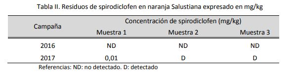 El presente trabajo ha determinado la presencia de residuos de spirodiclofen aplicado en un lote comercial de naranja para el control de ácaros.