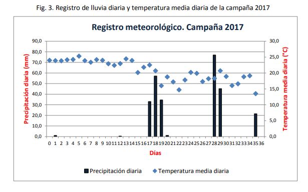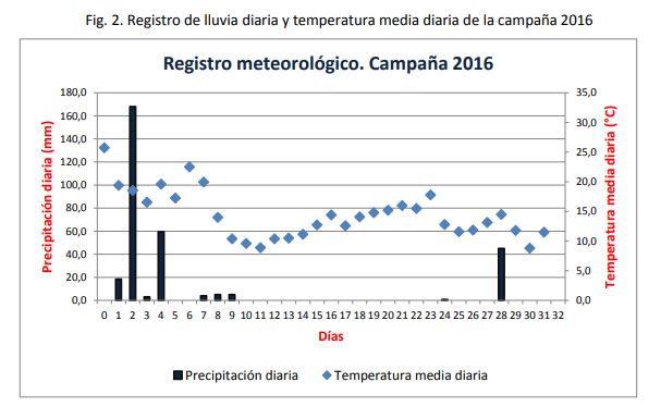 La temperatura media diaria para las campañas 2016 y 2017 fue de 14.9 y 20.7 °C respectivamente. En cuanto a las precipitaciones se observa una gran diferencia en los días posteriores a la aplicación del acaricida. Si se comparan los primeros 4 días, el acumulado en la campaña 2016 fue de 249 mm, mientras que en la campaña 2017 fue de 1 mm. Las intensas lluvias pudieron provocar la eliminación mecánica de los residuos de spirodiclofen durante la campaña 2016 explicando las diferencias con respecto al siguiente año. Los niveles de residuos en ambos periodos cumplen con las exigencias establecidas por la legislación nacional y por la legislación de la Unión Europea. Sin embargo, los valores correspondientes a la campaña 2017 estuvieron cerca del LRM establecido a nivel nacional.