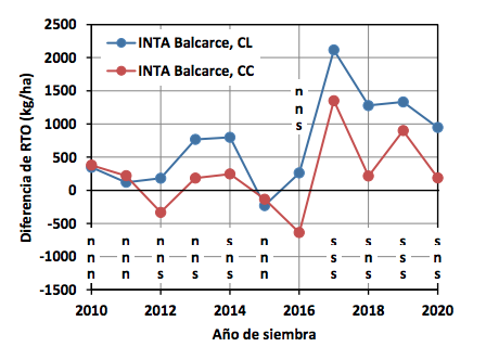 Fig. 1. Respuesta del rendimiento (RTO) entre el promedio de los tres cultivares de mayor RTO con aplicación de fungicida y el de los tres de mayor RTO sin aplicación de fungicida, en la primera época de siembra (cultivares de ciclo largo, CL) y en la tercera época (cultivares de ciclo corto, CC), de la Red de evaluación de cultivares de trigo conducida en INTA Balcarce. Las letras s y n indican diferencias estadísticamente significativas y no significativas respectivamente, para respuesta distinta de cero en cultivares de CL (primera fila de letras) y CC (segunda fila de letras), y diferencia de respuesta entre cultivares CL y CC (tercera fila de letras)