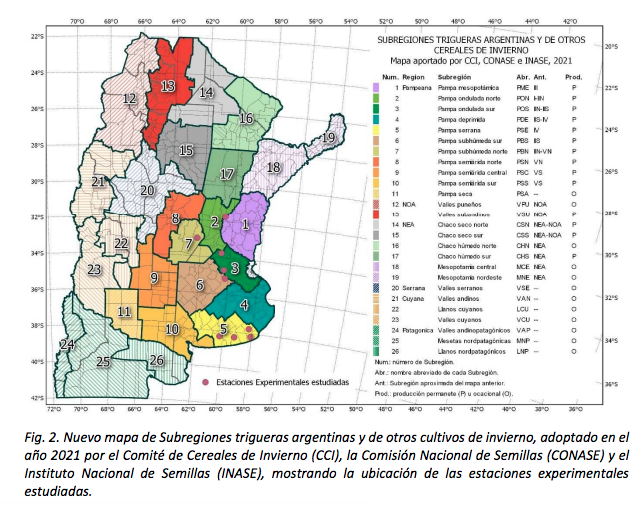 Los datos analizados provienen de la Red de Evaluación de Cultivares de Trigo coordinada por el Instituto Nacional de Semillas (RET-INASE), obtenidos entre las campañas 2010/2011 y 2020/2021. El análisis involucra todas las estaciones experimentales en que los ensayos se condujeron con y sin aplicación de fungicida y con continuidad histórica en datos (no más de 3 campañas sin datos durante el período considerado). Las estaciones (listadas por orden de latitud), están ubicadas en la actual Subregión 5 (ex Subr. IV, Fig. 2): Barrow (responsable actual de la conducción de los ensayos F. Di Pane, CEI Barrow), La Dulce (L. González et al., Criadero Buck), Miramar (M. Villafañe, CE Miramar) y Balcarce (P.E. Abbate, INTA Balcarce), y las otras cinco al norte de las anteriores: Plá (Criadero Klein, Subr. 6), Chacabuco (Criadero Don Mario, Subr. 3), Pergamino (J.J. Lanzillotta e I. Terrile, INTA Pergamino, Subr. 3), Marcos Juárez (D. Gómez et al., INTA Marcos Juárez, Subr. 7) y Paraná (L.C. Gieco y L.S. Schutt, INTA Paraná, Subr. 1). Los datos originales pueden consultarse en https://www.argentina.gob.ar/inase/red-variedades-de-trigo o https://cultivaresargentinos.com/trigo/.