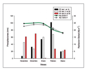 Se registraron todas las variables meteorológicas de importancia durante el ensayo. En la Figura 2 se puede observar las precipitaciones y la radiación global en los meses donde se llevó a cabo el experimento. Al analizar los datos de la radiación global de la campaña versus la media histórica se observó que durante los primeros meses la media fue superior a la media histórica en los primeros meses del cultivo. En cambio, en los meses posteriores no se observó dicha diferencia. Las precipitaciones para cada mes en los cuales se llevó a cabo el ensayo, fueron divididas y se representan en la Figura 2, según se registraron desde el 1º al 10º, 11º al 20º o 21 al 30º días de cada mes. Se observó una distribución regular entre los meses, evaluados, con excepción a los últimos días del mes de enero donde se presentaron condiciones de restricción hídrica y altas temperaturas.