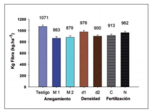 En la Figura 3 se puede observar el efecto de cada uno de los tratamientos aplicados sobre el rendimiento de fibra del algodón. Claramente, los efectos que produjeron las disminuciones significativas más importantes fueron los anegamientos. No obstante, se observa una pequeña diferencia para los distanciamientos entre surcos utilizados y, por último, no hubo diferencias significativas entre la aplicación del fertilizante y el control. Con relación al tratamiento de anegamiento, los promedios de rendimiento presentaron una pérdida de rendimiento del 24 y 22 % para M1 y M2 respectivamente. Con respecto a la calidad de fibra analizada (Tabla 1), lo primera conclusión es que, en general, los valores observados son de buenos a muy buenos, quedando la mayoría en el rango de premiación para la comercialización. Por otro lado,los únicos parámetros que presentaron variación significativa entre los tratamientos analizados fueron UHML y Micronaire. UHML fue mayor en los tratamientos donde el distanciamiento entre surcos fue mayor (d2), esto pudo deberse a que contaron con una mayor cantidad de recursos disponibles para el crecimiento. Por otro lado, Micronaire fue menor para M1 y M2. Esto podría deberse a que el anegamiento produjo restricciones en el crecimiento, provocando una disminución en el engrosamiento de la pared celular de las fibras.