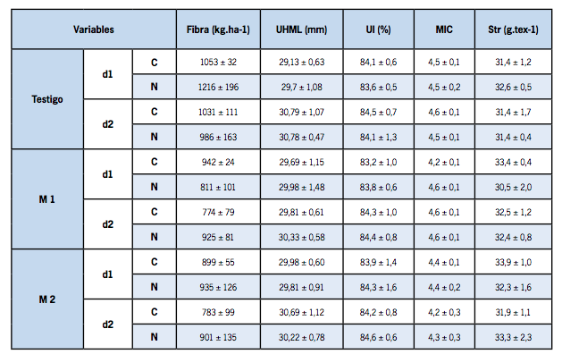 Los resultados de los promedios de las tres repeticiones para rendimiento de fibra y parámetros de calidad de cada tratamiento aplicado se expresan en la Tabla 1. El tratamiento que no sufrió anegamiento (testigo), con distanciamiento de 0,52 cm entre surco (d1) y con fertilización (N) fue el que mayor rendimiento presentó (1.216 kg ha-1). En cambio, el tratamiento donde el anegamiento se produjo en 1º flor (M1) con un distanciamiento de 1,04 metros entre hileras (d2) y sin fertilización, registro el menor rendimiento (774 kg ha-1).