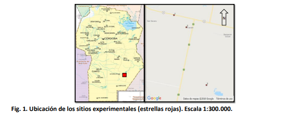 Durante la campaña 2017/18 se llevaron a cabo tres ensayos de aplicación de dosis creciente de nitrógeno en el cultivo de maíz, en el sur del departamento Unión (Córdoba). Los ensayos experimentales se llevaron a cabo en lotes de producción (Fig. 1). En los sitios 1 y 2 el suelo Haplustol éntico corresponde a la Serie Canals, y el sitio 3 se ubica sobra la serie Leguizamón con suelo Haplustol údico (Carta de suelos de la República Argentina, 1986). Los tratamientos consistieron en 5 dosis de fertilizante: 0, 30, 60, 120, y 180 kg/ha de nitrógeno, en forma de urea, aplicado al voleo en estado de V5-V6 de los cultivos.