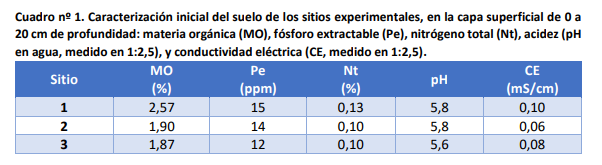El manejo agronómico de los cultivos (a excepción de la fertilización nitrogenada) se realizó siguiendo las prácticas utilizadas por el productor. La fecha de siembra fue el 18/09/2017, 17/09/2017 y 01/10/2017, en el sitio 1, 2, y 3 respectivamente. El híbrido utilizado fue 7822 HCL, DK 710, y Next 22.6 PW, en el sitio 1, 2, y 3 respectivamente. En el sitio 1 se fertilizó con 100 N kg/ha de MAP (10-52-0) al momento de la siembra de forma incorporada, el sitio 2 no recibió fertilización a la siembra, y en tanto en el sitio 3 fue de 100 kg/ha de MicroEssentials SZ (12-40- 0, S10 Zn1). La densidad de plantas logradas en todos los sitios fue en promedio de 75000 pl/ha. Al momento de la siembra, en cada sitio experimental, se extrajeron tres muestras de suelo hasta los 200 cm de profundidad, en las capas de 0-20, 20-40, 40-60, 60-100, 100-150, y 150- 200 cm, para determinar el contenido de humedad por el método gravimétrico. El contenido hídrico se expresó en mm de agua, considerando valores de densidad aparente, y constantes hídricas de referencias personales (Cazorla, com. pers.). Además se tomó una muestra compuesta (12 submuestras) de la capa superficial (0-20 cm de profundidad) para realizar una caracterización de cada sitio, y se determinó: materia orgánica (MO), fósforo extractable (Pe), nitrógeno total (Nt), acidez (pH en agua, medido en 1:2,5), y conductividad eléctrica (CE, medido en 1:2,5), (Cuadro 1).