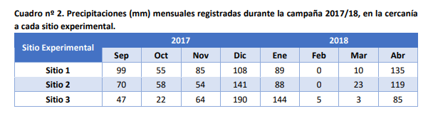 En estado V5-V6 de los cultivos de maíz y previo a la fertilización se extrajo una muestra de suelos compuesta (8 submuestras) en cada bloque de cada sitio experimental, en las capas de 0-20, 20-40, y 40-60 cm para la determinación de nitrógeno de nitratos, que se conservó en frío hasta su ingreso al laboratorio. En madurez fisiológica de los cultivos se realizó la cosecha manual de una superficie de 3,15 m2 , y posterior trilla con máquina estática. Se registró el peso y el número de granos por m2 , y el número de espigas por planta (prolificidad). Los datos de rendimiento en grano se expresaron con 13% de humedad. Se calculó la eficiencia de uso del N (EUN) mediante la diferencia entre el rendimiento de los tratamientos fertilizados y el testigo (dosis de N 0 kg/ha), dividido la dosis de N agregada como fertilizante. El diseño de los ensayos fue en bloques completos al azar, con 4 repeticiones. El tamaño de las parcelas fue de 31,5 m2 . Los resultados se analizaron con el programa Infostat (Di Rienzo et al., 2017), y las diferencias de medias se determinaron a través de Tukey (p<0,05). Se analizó la relación entre el rendimiento de los cultivos y el contenido de N disponible. Se registraron las precipitaciones mensuales desde septiembre de 2017 hasta abril de 2018 en un establecimiento cercano a cada sitio experimental (Cuadro 2). ><0,05) Se analizó la relación entre el rendimiento de los cultivos y el contenido de N disponible. Se registraron las precipitaciones mensuales desde septiembre de 2017 hasta abril de 2018 en un establecimiento cercano a cada sitio experimental (Cuadro 2).