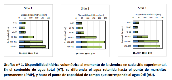 La implantación de los cultivos se realizó de manera óptima en todos los sitios, ya que los suelos se encontraban con un contenido hídrico mayor (sitio 1) o igual (sitio 2 y 3) al punto de capacidad de campo (CC), en la capa superficial, al momento de la siembra (Gráfico 1). En todos los sitios experimentales, al analizar el perfil de suelo completo, el contenido hídrico fue mayor al punto de capacidad de campo, y se observó la presencia de una capa freática que su influencia alcanzara los 80 cm de profundidad, por lo tanto, los cultivos iniciaron su ciclo con excelentes reservas hídricas.