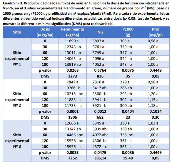 En la campaña 2017/18 en los sitios evaluados ubicados en el sur de departamento Unión (Córdoba) se observó una respuesta significativa positiva de la fertilización nitrogenada sobre el rendimiento de los cultivos de maíz. Los umbrales de ajuste de la fertilización nitrogenada fueron de 258, 215, y 163 kg/ha (N suelo + N fertilizante) para un rendimiento de 14228, 11928, y 16039 kg/ha respectivamente (sitio 1, 2, y 3).