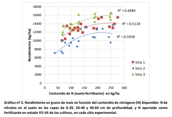 El contenido de nitrógeno de nitratos del suelo al momento de la fertilización de los cultivos (estado V5-V6), fue en promedio de 82, 70, y 62 kg N/ha hasta los 60 cm de profundidad del suelo, en el sitio 1, 2, y 3, respectivamente (Gráfico 2).