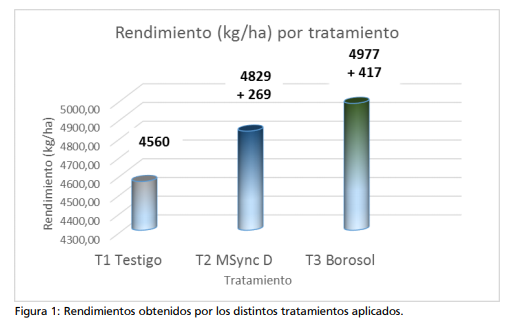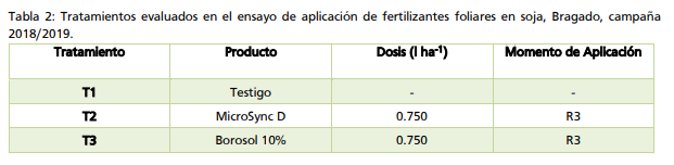 En la Tabla 2 se describen los tratamientos aplicados. Uno de los tratamientos se hizo con Borosol, que es una forma de boro soluble al 10% utilizado para la prevención y corrección de deficiencias de este nutriente en los cultivos y el otro con Microsync D, un producto, específico para dicotiledóneas, que permite la removilización de nutrientes que ya se encuentran dentro de la planta. Sobre una muestra de grano de cada tratamiento, se determinaron los componentes de rendimiento, número (NG) y peso de los granos (PMG). El diseño experimental del ensayo fue en bloques al azar con tres repeticiones. El rendimiento de la soja y sus componentes de rindes se analizaron mediante análisis de la varianza. La cosecha se realizó el 16 de abril de 2019 mediante cosecha manual.