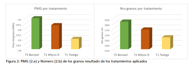 La respuesta en rendimiento de los T3 y del T2 puede estar explicado en el incremento del PMG y del número de granos (Figura 2.a y 2.b). Analizando los componentes del rinde, se encontraron diferencias significativas en el PMG a favor del tratamiento de aplicación de boro. El resto de las diferencias no fueron significativas desde el punto de vista estadístico.
