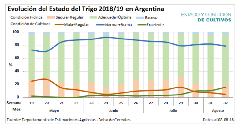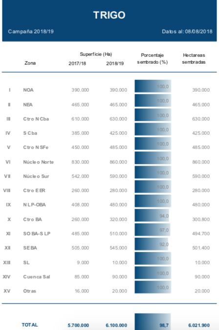 La siembra de trigo se encuentra próxima a finalizar, restando sólo la implantación de 78.000 hectáreas que se concentran sobre las regiones Centro de Buenos Aires, Sudoeste de Buenos Aires-Sur de La Pampa y Sudeste de Buenos Aires. Sobre este escenario, el progreso nacional alcanzó el 98,7 % de las 6.100.000 hectáreas proyectadas para la campaña 2018/19. El área incorporada superó las 6 millones de hectáreas y según nuestro Informe de Estado y Condición de Cultivos más del 46 % del trigo mantiene una condición entre buena y excelente.