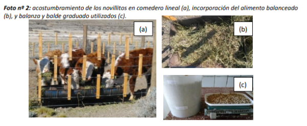 El periodo de acostumbramiento se extendió por 18 días. Los primeros dos días solo consumieron HA en un comedero lineal (Foto 2). La incorporación del AB comenzó a partir del 3º día de encierre, representando un 5% del total de la ración. Posteriormente, cada3 días se disminuyó la proporción de heno y se incrementó gradualmente el alimento balanceado a valores de10, 30, 50, 70, hasta llegar al 80% (ración de engorde).