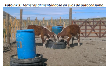Se utilizaron instalaciones ya existentes en el establecimiento, donde se realizan los trabajos periódicos con los animales. El corral seleccionado permitía una disponibilidad de 8m2 /animal. El agua se suministró mediante un carro tanque de 3000 litros y bebederos de plástico. El consumo de agua fue de alrededor de 20-25 litros diarios por animal. En la etapa de acostumbramiento se utilizó un comedero lineal, con una disponibilidad de 50 cm por animal. Culminado dicho periodo se incorporaron los silos comederos (Foto 3). Este tipo de comedero se construyó con cubiertas de camiones usadas (2 unidades) y tambores de 200 litros (2 unidades); materiales que normalmente se encuentran en los establecimientos.