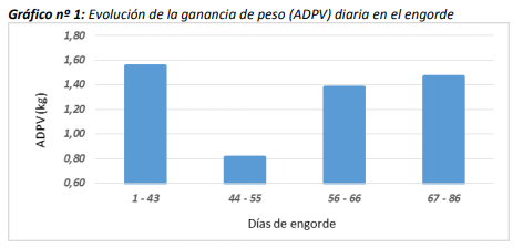 La experiencia se extendió durante 86 días. La duración de la en función del desempeño de los animales en el corral y de la oportunidad de su comercialización. Los animales consumieron en promedio 8,7 kg de ración diaria (1,8 kg HA y 6,9 kg AB). El consumo expresado como porcentaje del peso vivo representó 2,5% (total de kilos de alimento consumido / total de kilogramos de peso vivo ganados). A continuación, se muestra la evolución de la ganancia de peso diaria durante el engorde. La ganancia de peso diaria promedio de 1,26 kg/animal (desbastado). En el Gráfico nº 1 puede observarse una disminución de la ganancia entre los días 43 y 55. En dicho período los animales tuvieron acceso a un corral de mayores dimensiones y pasaron más tiempo lejos de los comederos, esto pudo haber afectado su nivel de consumo.