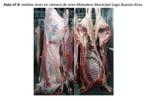 En la comercialización intervinieron tres eslabones de la cadena de la carne (productor-mataderocarnicería). Los animales se faenaron en dos etapas, en función de la oportunidad de venta (terminación de animales y demanda de la carnicería). Dada las características del acuerdo entre el productor y el comprador, la primera venta se realizó bajo la forma de kilogramo de res en gancho (Foto 4) y la segunda en kilos vivos en pie.