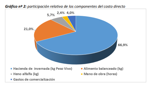 El análisis económico del engorde se realizó con la metodología del margen bruto (MB), la cual consiste en restar al valor de la producción los costos directos que le son atribuibles. El principal componente del costo es la hacienda, representando un valor superior al 65%, seguido por los alimentos que integraron la ración (26,7%) y en última instancia los gastos de comercialización y la mano de obra (Gráfico 3).