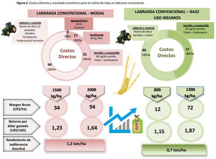 El trigo es uno de los principales cereales de invierno realizados en la zona semiárida. A continuación, se presenta el análisis económico para la campaña de fina 2019/2020. Se evaluaron cuatro formas de producción en función al nivel tecnológico adoptado en cada caso. Para cada modalidad productiva, se establecieron los costos directos asociados en base a las labores realizadas y los insumos aplicados. Para los mismos se utilizaron valores de referencia a nivel regional a mayo 2019 sin IVA. En el caso de la siembra directa se asume que las labores han sido contratadas, y en el caso de siembra convencional se consideró el uso de maquinaria propia. Posteriormente se efectuó el cálculo del margen bruto por hectárea en base a un umbral de rendimiento esperado, a efectos de poder establecer la variación en el resultado económico en cada caso. Para el cálculo de los resultados económicos se consideró el valor de la tonelada de trigo a enero 2020, informada por el Mercado a Término de Buenos Aires (MATba) el cual es de 162 U$S/ton.