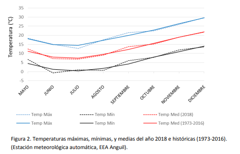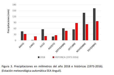 Las condiciones climáticas de la campaña 2018/2019 registradas en la EEA Anguil se muestran en las Figuras 2 y 3. Las temperaturas fueron similares a la media histórica excepto en el mes de junio donde la mínima fue inferior en 2°C y durante el mes de septiembre se observó un inicio de primavera más cálido con una media superior a las histórica en 2°C. de la máxima, con precipitaciones de otoño en abundancia que recargaron el perfil de suelo al inicio de la siembra, acompañadas por lluvias consideradas adecuadas en cuanto a cantidad y distribución a través de todo el ciclo del cultivo.