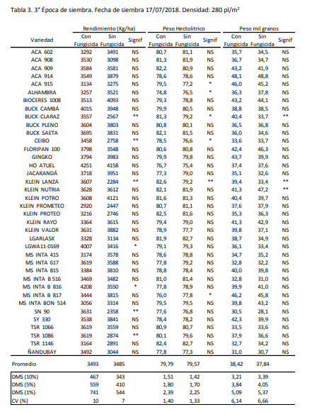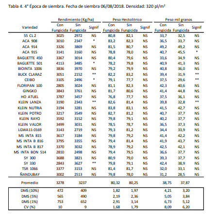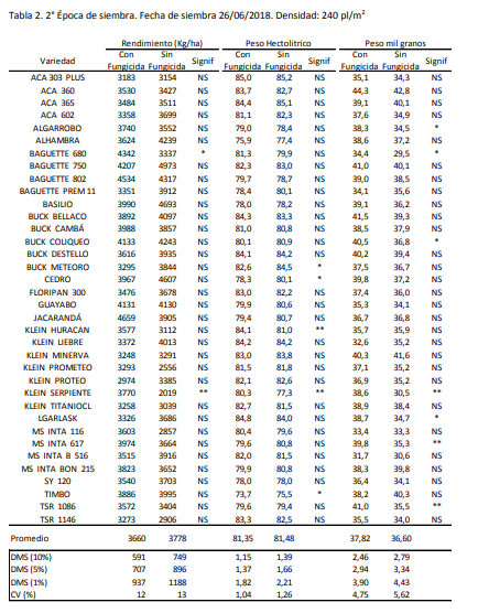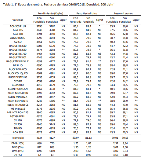 Los datos obtenidos se analizaron primeramente por separado por fecha y aplicación de fungicida (con y sin aplicación) y luego mediante un análisis combinado por fecha (Cochran y Cox, 1957), y se calcularon las diferencias mínimas significativas para α= 0,10; 0,05 y 0,01 para las comparaciones entre variedades con y sin fungicida (Tablas 1, 2, 3 y 4). El efecto de la aplicación del fungicida en cada variedad se evaluó por un contraste de un grado de libertad, testeado por una prueba F cuya significancia se indica de la manera acostumbrada (ns: no significativo, * y **: significativo al 5 y al 1 %, respectivamente). El efecto de variedad fue altamente significativo en las cuatro épocas de siembra para todas las variables analizadas, lo mismo que la interacción variedad x fungicida, mientras que el efecto de fungicida fue significativo o altamente significativo para rendimiento, peso hectolítrico y de mil granos.