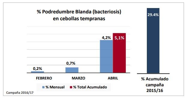 En términos generales se puede decir que tanto las cebollas tempranas como las tardías de la campaña 2016/17, tuvieron valores de incidencia de podredumbres menores comparados a las campañas anteriores. Los lotes de cebolla temprana presentaron menor incidencia de podredumbre de cuello que los de cebolla tardía: en el 70% de los lotes de tempranas hubo menos de 5% de bulbos de la muestra afectados, contra 22% en el caso de la cebolla tardía. En cambio, hubo más incidencia de Podredumbre Basal en los lotes de temprana. Los casos particulares de lotes de cebolla tardía con altos porcentajes de incidencia de Podredumbre Blanda (conocida como bacteriosis) corresponden a lotes afectados por el granizo sumado a la elevada precipitación caída la primera quincena de febrero, específicamente aquellos que estaban próximos a cosecha.
