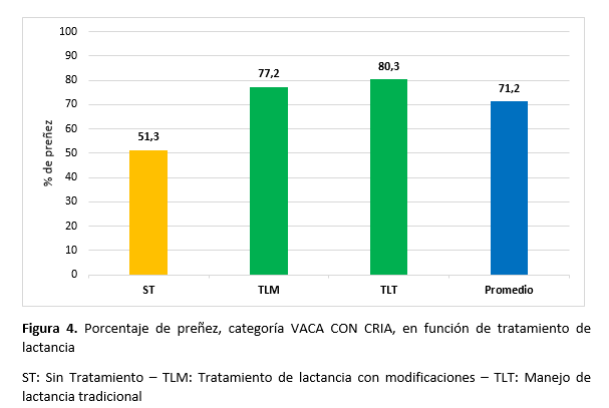 En rodeos donde se hizo tratamiento de lactancia típico (TLT), el resultado de preñez fue de 80.3 % (18.701 vacas). Mientras que si se toman a todos aquellos establecimientos que hicieron algún manejo de lactancia (TLM), el resultado fue de 77.2 % de preñez (35.799 vacas). Y, por último, si se toman aquellos vientres que no recibieron ningún tipo de tratamiento de lactancia (ST), el resultado fue de 51.3 % (14.447 vacas). Es importante aclarar que en estos establecimientos no se hacen diagnóstico de ciclicidad y tratamientos (enlatados ni destete precoz) (Figura 4).